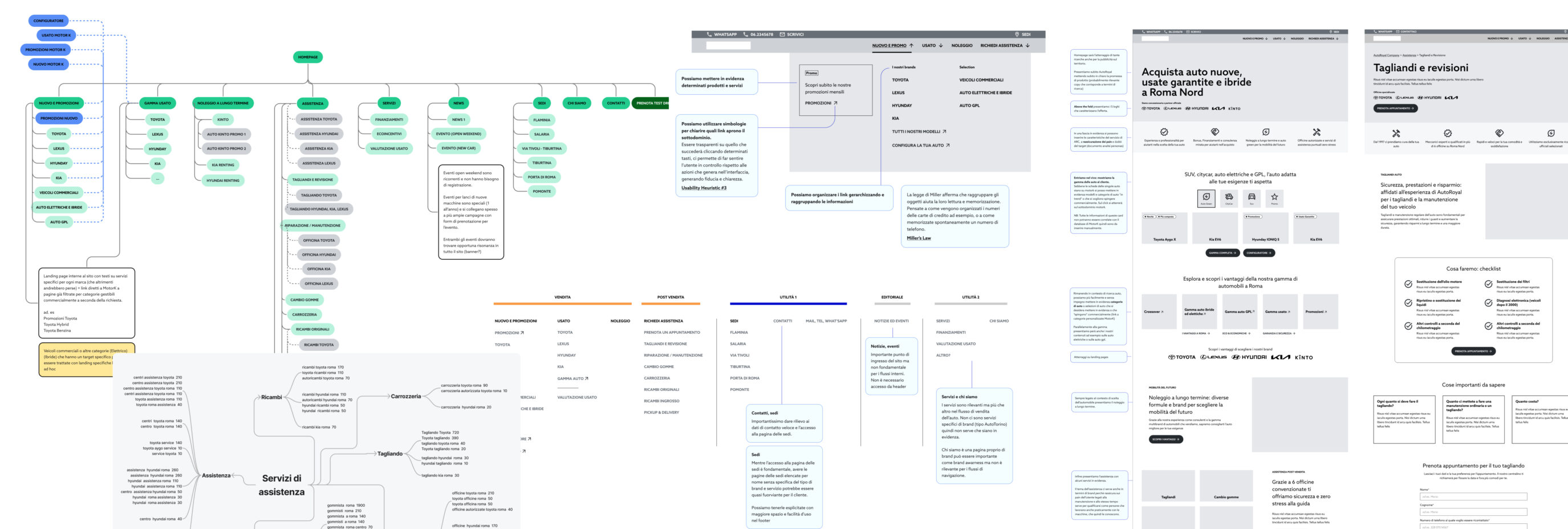Landing page, categorie e servizi sono stati progettati per intercettare ricerche organiche specifiche (es. “tagliando Toyota Roma”, “gommista Kia Salaria”) e guidare la navigazione fino al contatto o alla conversione. La struttura del menu è stata semplificata e organizzata in modo gerarchico, per ridurre il carico cognitivo e rendere ogni percorso più chiaro e orientato all’obiettivo.