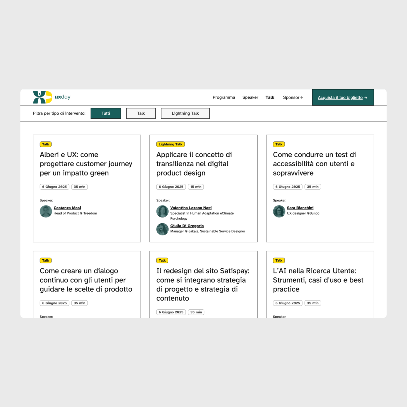 Ci siamo anche concentrati sull’esperienza utente, focalizzandoci sui momenti critici di navigazione del sito, come ad esempio la consultazione del programma della conferenza. Per questo abbiamo progettato uno schedule flessibile e mobile-first per favorire la navigazione da smartphone durante l’evento dal vivo.