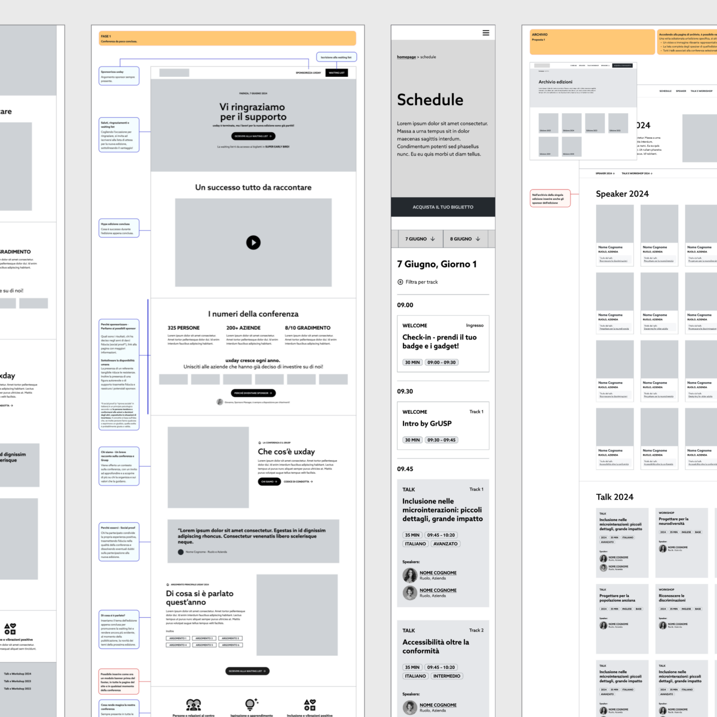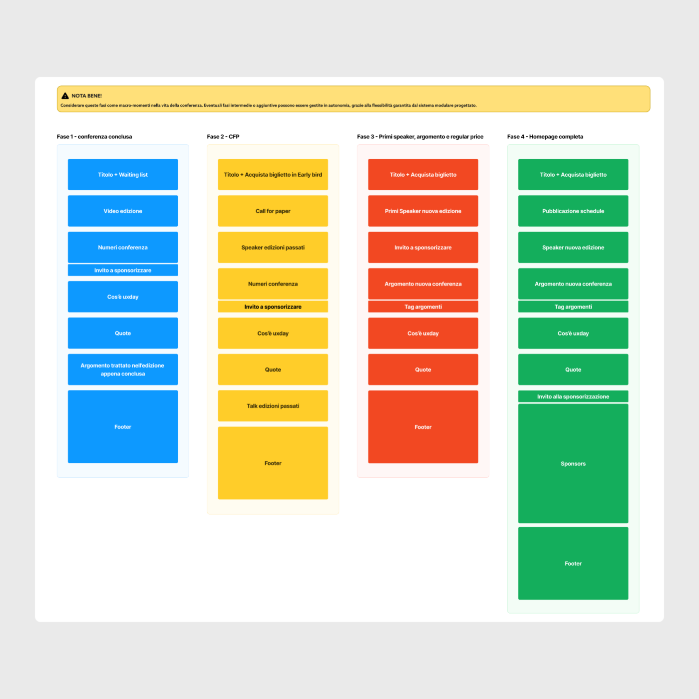 In una sessione congiunta designer e developer, abbiamo quindi mappato tutti i momenti chiave della vita di alcune conferenze del GrUSP — dalla call for paper alla vendita dei biglietti, dalla pubblicazione degli speaker fino all’archivio delle edizioni precedenti.
