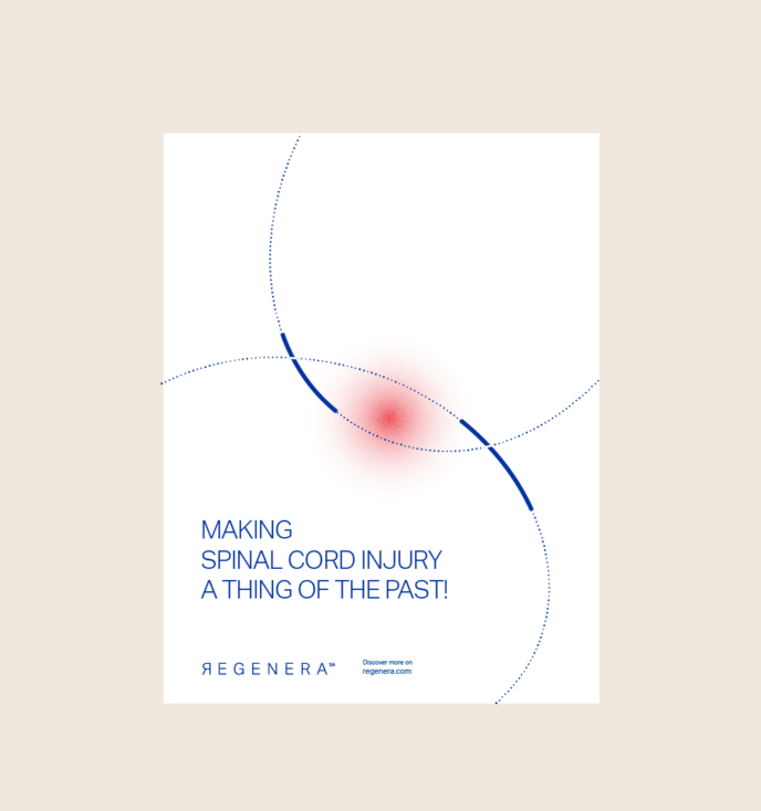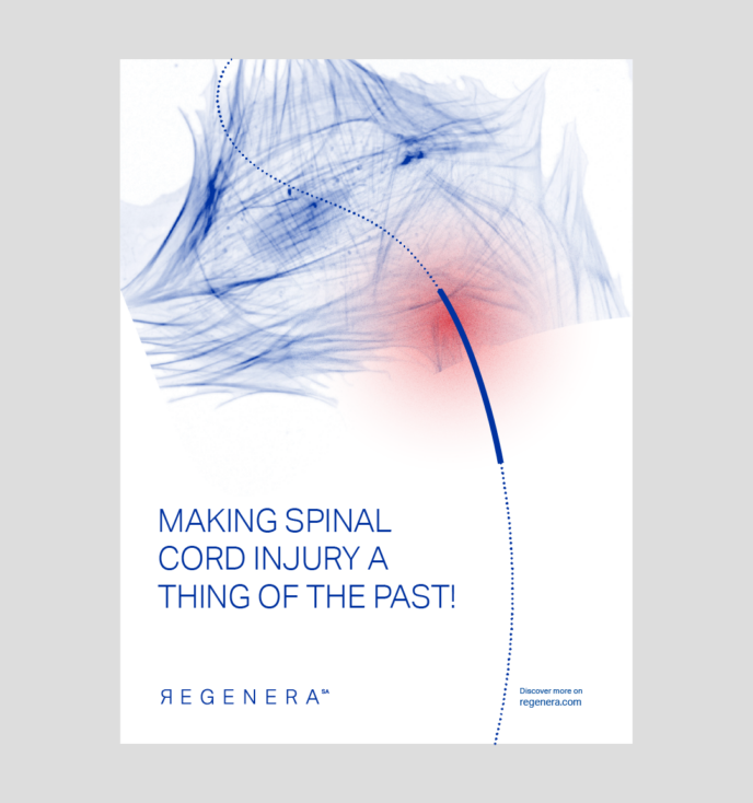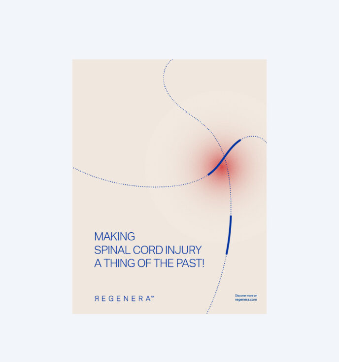 Questo gesto grafico rappresenta la promessa del brand: riportare la lesione del midollo spinale allo stato originario e consentire il recupero delle capacità motorie. Il linguaggio visivo è volutamente essenziale e pulito, coerente con il contesto scientifico e con un tono di voce concreto e professionale.