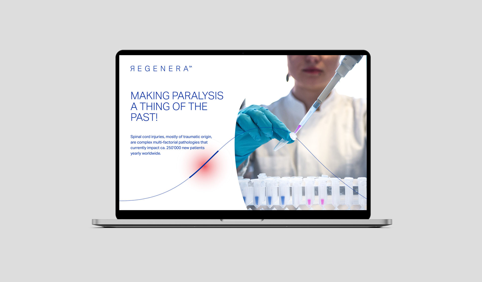 All’interno di queste linee viene introdotto un punto rosso che rappresenta la lesione e un’interruzione grafica delle curve che suggerisce il momento del trauma e il processo di riparazione. A questo linguaggio grafico si affiancano immagini di laboratorio — istologie, tecnici e attività di ricerca — insieme a immagini che anticipano l’obiettivo finale del progetto: la cura del paziente.