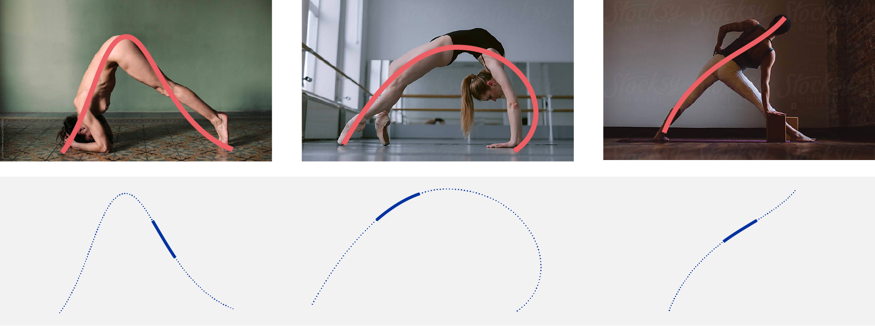Il concept visivo del brand prende come riferimento l’oggetto stesso della ricerca: la colonna vertebrale e la sua capacità di movimento. Le curve grafiche che caratterizzano l’identità derivano dalle linee sinuose generate dalla flessibilità della schiena e diventano l’elemento strutturale del sistema visivo.